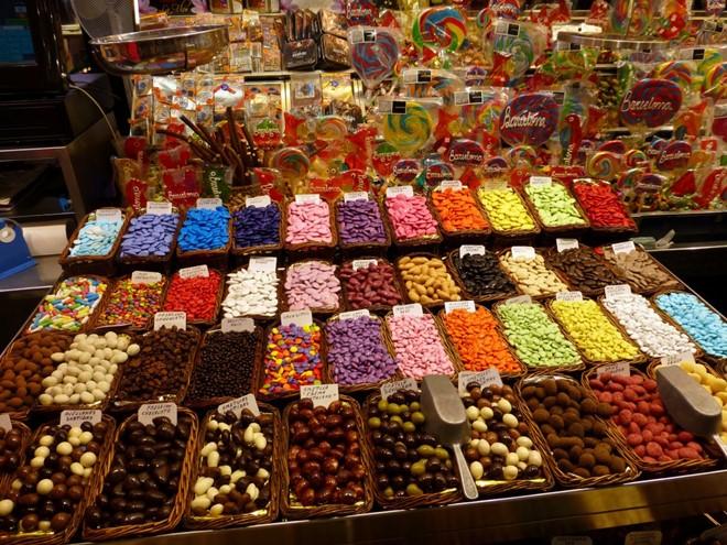 hay khám phá chợ Boqueria với các quầy bán đồ ăn và thực phẩm tươi ngon.