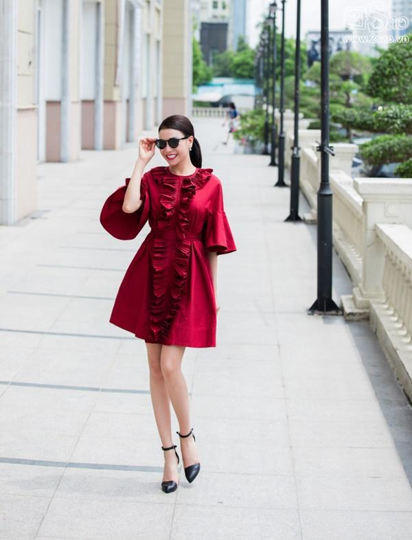 Bộ đầm màu đỏ đun cuả Trà Ngọc Hằng với lớp bèo nhún được xếp dài từ cổ đến chân