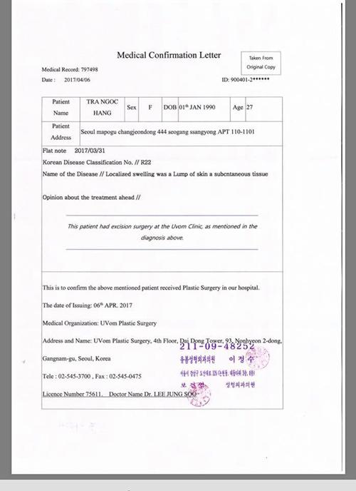 Hình ảnh và bằng chứng phẫu thuật tại Hàn Quốc được Trà Ngọc Hằng đưa ra