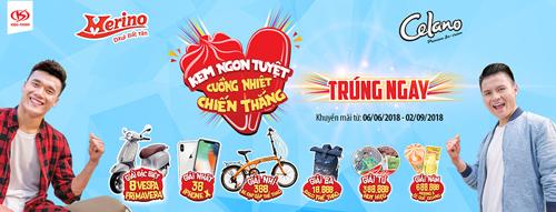 Chương trình “KEM NGON TUYỆT - CUỒNG NHIỆT CHIẾN THẮNG” diễn ra từ ngày 06/06 - 02/09/2018 với sự đồng hành của Tiến Dũng và Quang Hải. 08 giải đặc biệt xe Vespa Primavera thời thượng, 38 giải nhất cực đỉnh chiếc iPhone X, và hàng triệu giải thưởng giá trị khác như xe đạp gập thể thao, balo cực chất, huy hiệu thần tượng cùng kem Merino & Celano đang chờ đón bạn.