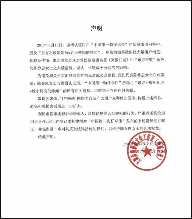 Công ty của Trần Kiều Ân lên tiếng: "Chúng tôi đại diện cho nữ diễn viên Trần Kiều Ân bác bỏ thông tin việc Trần Kiều Ân qua đêm cùng nam diễn viên họ W là hoàn toàn sai sự thật. Yêu cầu các tài khoản mạng xã hội dừng lại việc phát tán tin đồn. Chúng tôi cũng đã thu thập những bằng chứng gửi tới luật sư để khởi kiện tài khoản 'Trung Quốc đệ nhất cẩu tử Trác Vỹ' về hành vì phỉ báng và bôi nhọ".