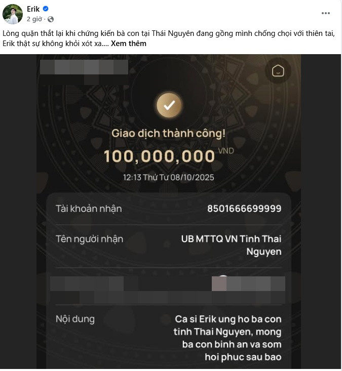 Nam ca sĩ quyên góp 100 triệu đồng chuyển thẳng vào tài khoản UB MTTQ VN Tinh Thai Nguyen kèm dòng trạng thái: "Lòng quặn thắt lại khi chứng kiến bà con tại Thái Nguyên đang gồng mình chống chọi với thiên tai, Erik thật sự không khỏi xót xa.