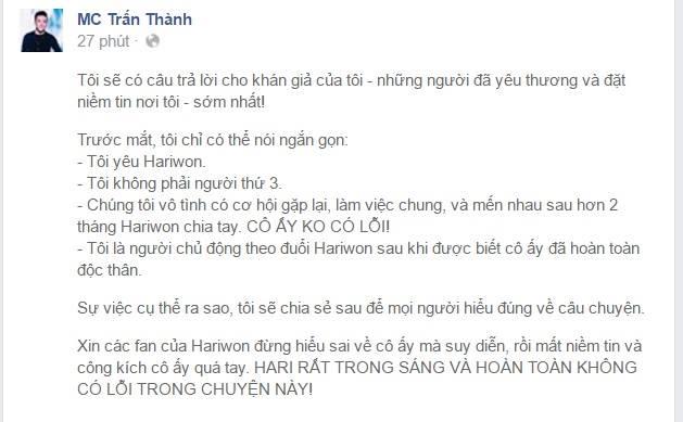 Xin các fan của Hariwon đừng hiểu sai về cô ấy mà suy diễn, rồi mất niềm tin và công kích cô ấy quá tay. Hari trong sáng và hoàn toàn không có lỗi trong chuyện này."