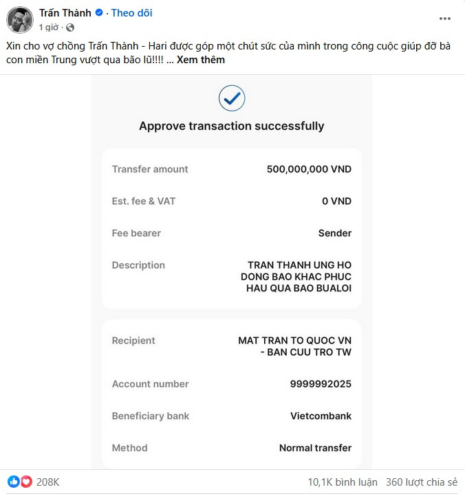 Theo đó, vợ chồng Trấn Thành chuyển nóng 500 triệu đồng đến quỹ Mặt trận Tổ quốc Việt Nam – Ban cứu trợ Trung ương.