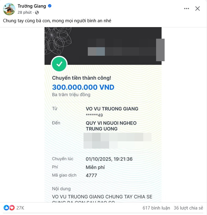 Cách đây ít phút, Trường Giang cũng cập nhật số tiền ủng hộ người dân vùng bão lũ. Theo đó, nam diễn viên chia sẻ: "Chung tay cùng bà con, mong mọi người bình an nhé. Cảm ơn bà con Tuyên Quang đã hỗ trợ trong mấy ngày quay vừa rồi dù mưa bão liên miên."