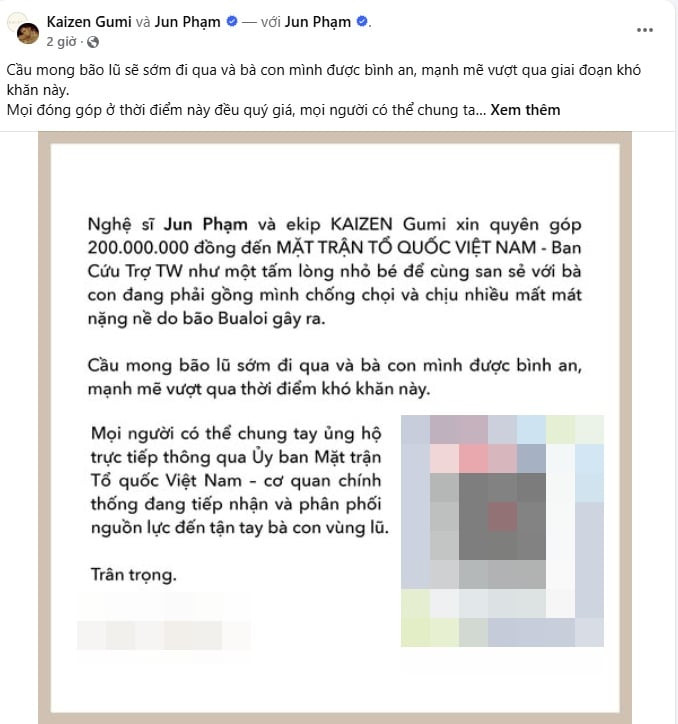 Jun Phạm cùng ekip cũng chung tay góp tấm lòng nhỏ bé ủng hộ bà con bị thiệt hại bởi bão số 10. Anh viết: "Cầu mong bão lũ sẽ sớm đi qua và bà con mình được bình an, mạnh mẽ vượt qua giai đoạn khó khăn này. "