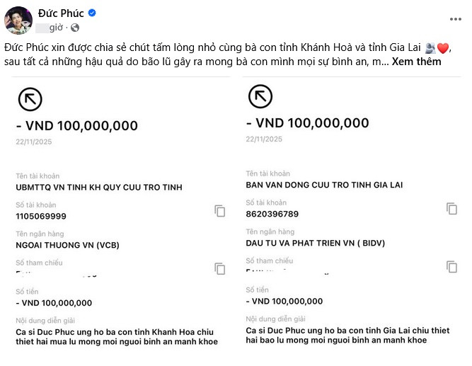 Đức Phúc cũng ủng hộ người dân hai tỉnh Gia Lai và Khánh Hòa mỗi tỉnh 100 triệu đồng. Nam ca sĩ viết trên trang cá nhân: "Đức Phúc xin được chia sẻ chút tấm lòng nhỏ cùng bà con tỉnh Khánh Hoà và tỉnh Gia Lai, sau tất cả những hậu quả do bão lũ gây ra mong bà con mình mọi sự bình an, mạnh khoẻ và sớm vượt qua giai đoạn khó khăn này ạ."