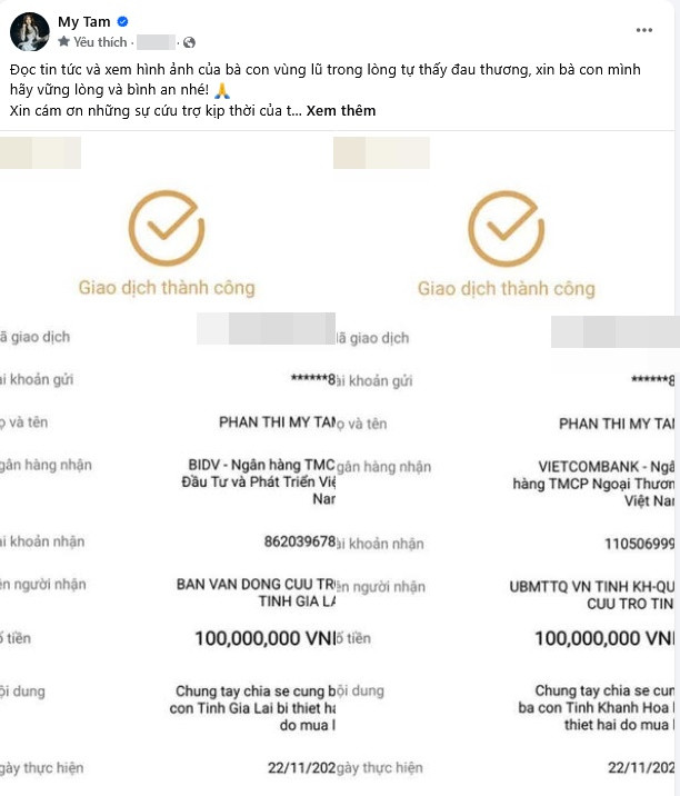 Mới đây, hai ca sĩ đình đám Vbiz tiếp tục cập nhật thêm số tiền lớn giúp đỡ người dân hai tỉnh Gia Lai và Khánh Hòa. Trong đó, Mỹ Tâm ủng hộ thêm mỗi tỉnh 100 triệu đồng.