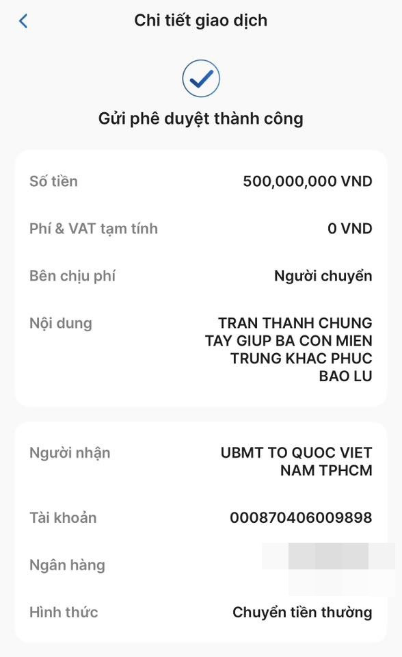 Kèm theo đó, nam MC đăng tải hình ảnh màn hình chuyển khoản 500 triệu đồng cho Ủy ban Mặt trận Tổ quốc Việt Nam Thành phố Hồ Chí Minh hưởng ứng theo lời kêu gọi của Chính phủ.