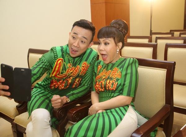Trấn Thành, Việt Hương đến từ sớm và tranh thủ "selfie" trước khi họp báo diễn ra.