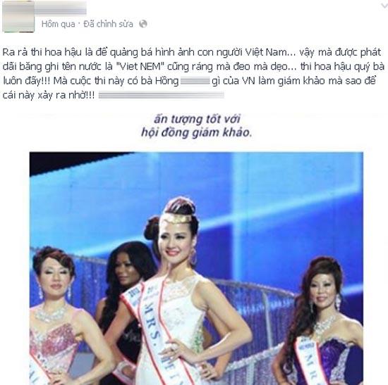 - Rất nhiều người tỏ ra khá bức xúc khi đại diện của Việt Nam tham gia Mrs World 2013 đã đeo dải băng sai tên quốc gia trong đêm chung kết.