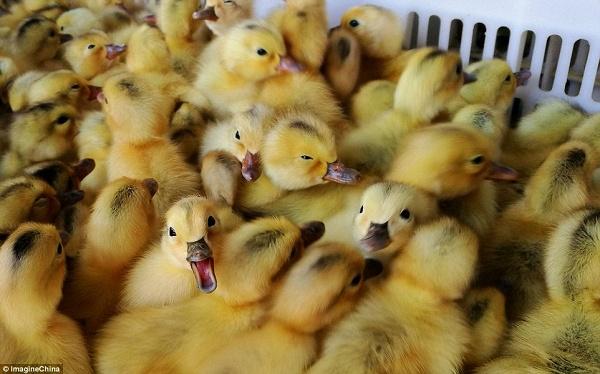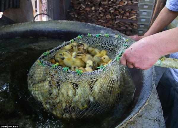 Đa số vịt bị trụng nước sôi mỗi ngày cho đến chết đều dưới 4 ngày tuổi. Chúng được vặt lông và đưa đến các trại nuôi rắn hay giao cho nhiều quầy ẩm thực đường phố khắp Trung Quốc.