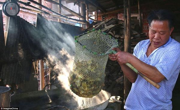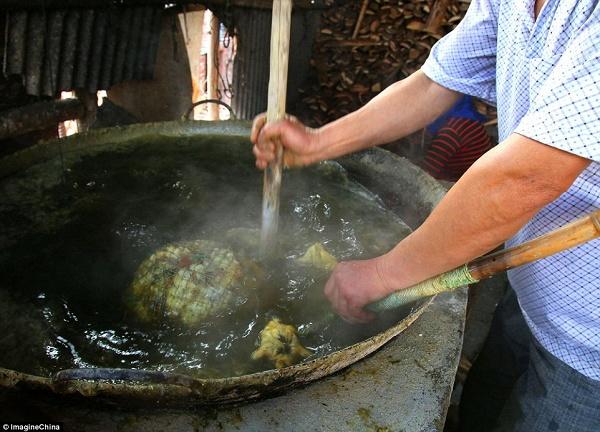 Để bảo đảm chúng chín đều, họ còn dùng cả một cây gậy gỗ để dìm đầu vịt vào nước sôi.