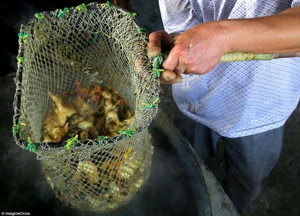 Người ta dùng chiếc vợt lớn để luộc một lúc cả đàn vịt con trong chảo nước sôi khổng lồ.