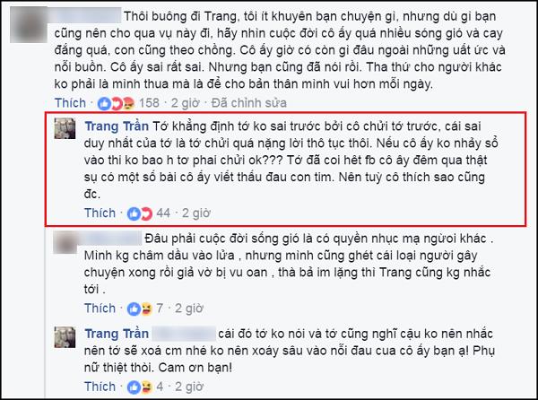 "Tớ đã coi hết Facebook cô ấy đêm qua. Thật sự có một số bài cô ấy viết thấu đau con tim. Nên tùy, cô thích sao cũng được", Trang Trần viết.