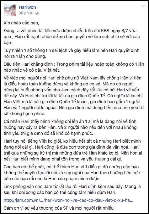 Trước scandal ập đến bất ngờ, Hari Won thẳng thắn lên tiếng phản bác. Thông qua fanpage của mình, nữ ca sĩ khẳng định: "Trong phim tài liệu hoàn toàn không có một lần nào nhắc về cô dâu Việt hết".