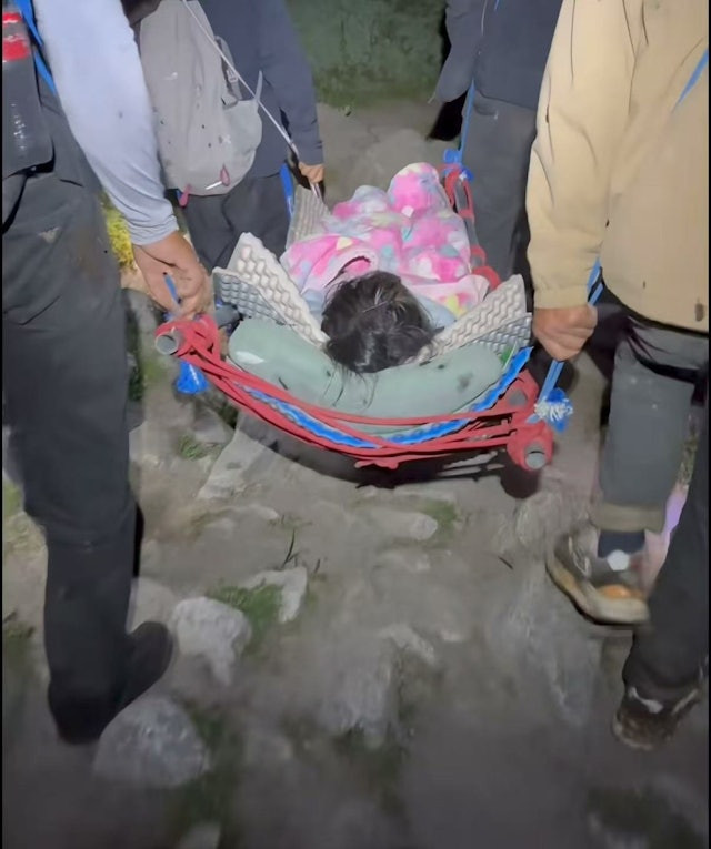Cụ thể, trong lúc chinh phục đỉnh núi tuyết cao hơn 4.000m, một nữ du khách họ Tiêu bị tảng đá lớn rơi trúng, khiến xương đùi gãy, các ngón chân dập nát và hoàn toàn không thể tự xuống núi.