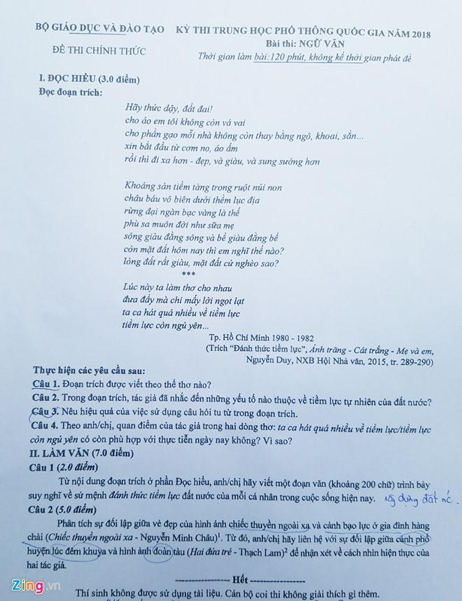 Đề thi môn Ngữ văn kỳ thi THPT quốc gia 2018.