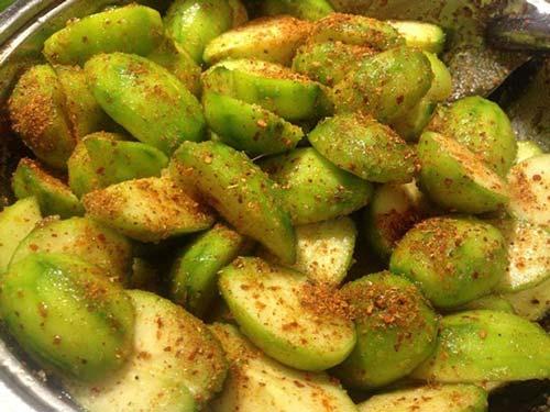 - Cóc sau khi mua về, bạn đem rửa sạch, dùng dao khía đều dọc quả cóc rồi lách mũi dao tách thành từng miếng nhỏ.