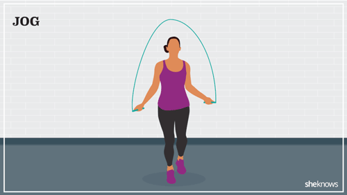- Nhấc chân phải lên như khi bắt đầu chạy bộ, đồng thời quăng dây qua đầu, khi dây gần tới bàn chân thì nhảy lên một chút để dây luồn qua bàn chân trái ra phía sau và hạ chân phải xuống, chân trái co lên.