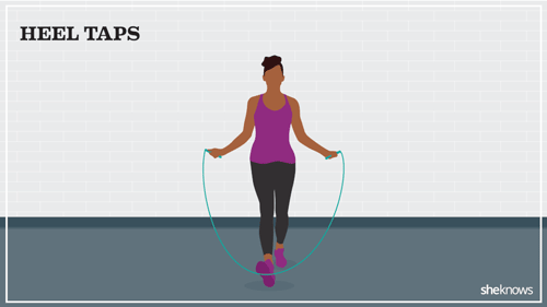 - Động tác này tương tự như chạy bộ cơ bản nhưng thay vì chạy tại chỗ và nâng một chân lên trong mỗi lượt nhảy thì ở động tác này bạn đá bàn chân ra phía trước, chạm gót chân xuống đất trước khi chuyển đổi chân.