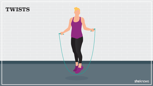 - Quăng dây qua đầu, khi dây gần đến bàn chân thì nhảy lên một chút, đồng thời xoay hông và chân của bạn sang một bên.