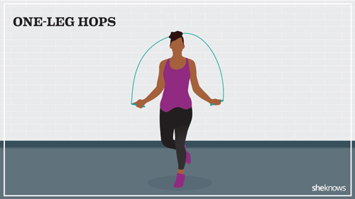 - Nhảy 1 chân cũng thực hiện tương tự như nhảy 2 chân, chỉ khác ở chỗ bạn co một chân lên và nhảy với chân còn lại chạm đất.