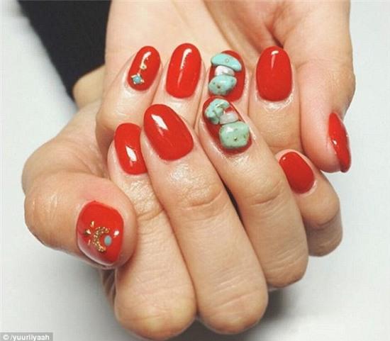 Yuurilliyaah, một người dùng Instagram vừa khoe bộ móng đỏ của mình với một viên đá nhỏ gắn trên. Trong khi đó, Sty_nail khoe móng tay trắng, vẽ vàng để tạo hình khối như đá nứt.