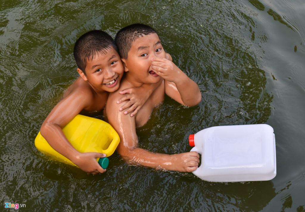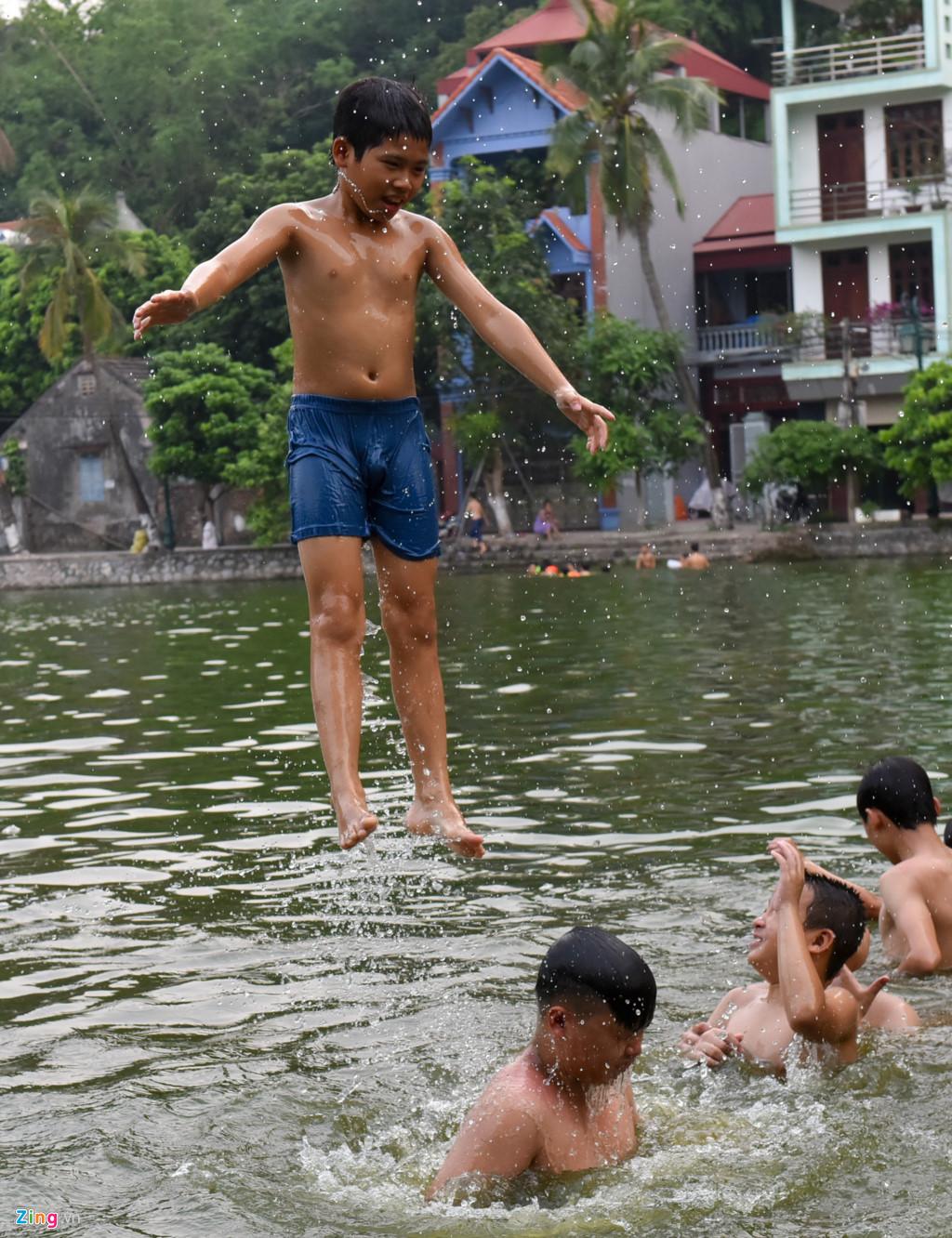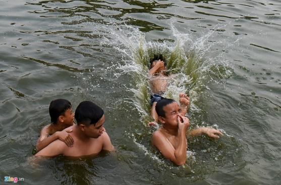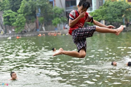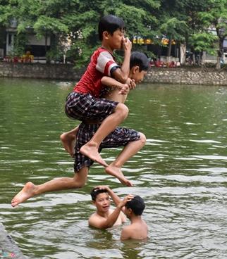 Các em nhỏ vui đùa dưới làn nước mát Bơi lội, oẳn tù tì, bật nhảy... các em bé ở xã Sài Sơn (Quốc Oai, Hà Nội) thoả sức nô đùa bên ao làng nghìn năm tuổi.