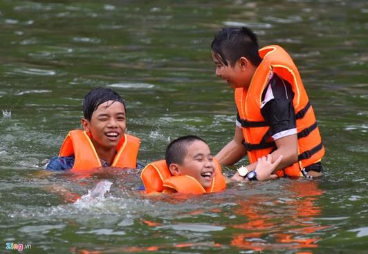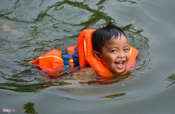 Những em nhỏ chưa biết bơi được bố mẹ sắm cho áo phao để đảm bảo an toàn. Trong ảnh là bé An, 7 tuổi, đang vẫy vùng trong làn nước mát.