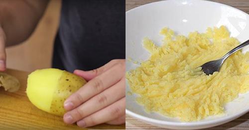 - Rửa sạch khoai tây bằng nước, rồi cho vào nồi luộc, đến khi chín thì bóc bỏ vỏ, lấy phần thịt cho ra bát, dùng thìa nghiền nát.