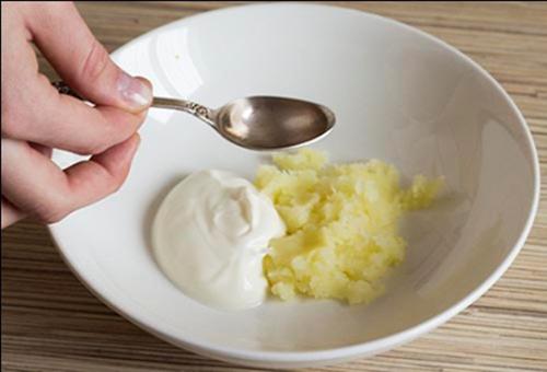 - Vắt lấy nước cốt chanh bỏ vào bát khoai tây cùng với sữa chua không đường, dùng thìa khuấy đều tay đến khi thu được hỗn hợp đồng nhất.