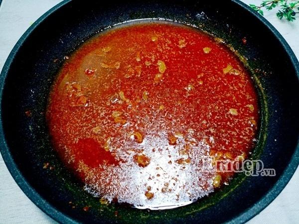 Bước 4: Bắc chảo lên bếp, cho mỡ heo vào đun sôi. Sau đó, bạn cho tỏi và ớt băm nhuyễn vào phi thơm. Tiếp theo, bạn cho nước mắm, bột ngọt, đường và nước lọc vào chảo, đun sôi thành hỗn hợp nước sốt đậm đà, vừa miệng.