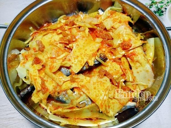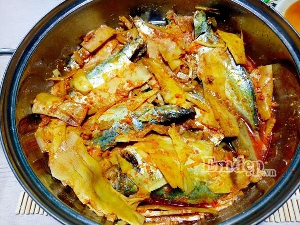 Bước 5: Xếp cá vào nồi, lần lượt 1 lớp cá rồi đến 1 lớp măng. Sau đó, bạn cho hỗn hợp nước sốt (ở bước 4) vào nồi và kho trên lửa vừa, nhỏ.