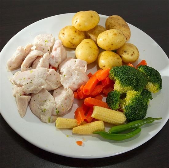 Sợ rằng ức gà sẽ bị sống, chúng tôi thái chúng thành nhiều mảnh lớn trước khi cho vào máy giặt ở nhiệt độ 80 độ C cùng với một ít rau và khoai tây. Khi đã bày lên đĩa, chắc ai cũng không phân biệt nổi đĩa rau này với đĩa được nấu bình thường đâu. Gà thì cực ngon, rau chín mềm, chỉ có mỗi khoai là hơi cứng một chút mà thôi.