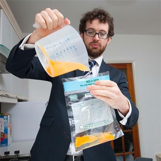 Đập 5 quả trứng vào một chiếc túi với một thìa bơ và vài giọt sữa, chúng tôi quyết định bỏ qua công đoạn đánh trứng mà cho luôn vào máy giặt với tần suất 1400 vòng quay ở nhiệt độ 90 độ C. Đáng buồn là chiếc túi có vẻ không chịu đựng được tốc độ này và rách toạc ngay trong máy giặt, khiến trứng lẫn bơ ở trong túi bầy nhầy không nhìn ra nổi là gì.