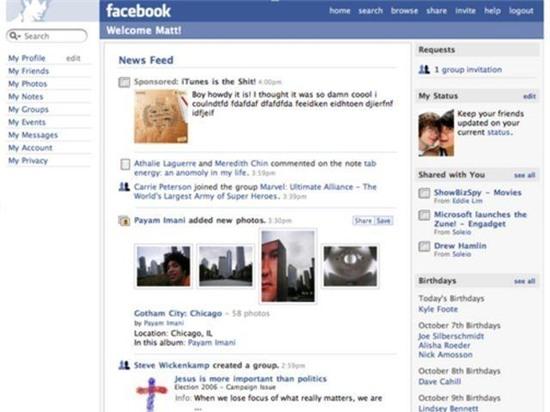 Màn hình giao diện Facebook khi mới ra mắt vào năm 2006, rất đơn giản và có phẩn giống...Wikipadia từ màu sắc tới font chữ