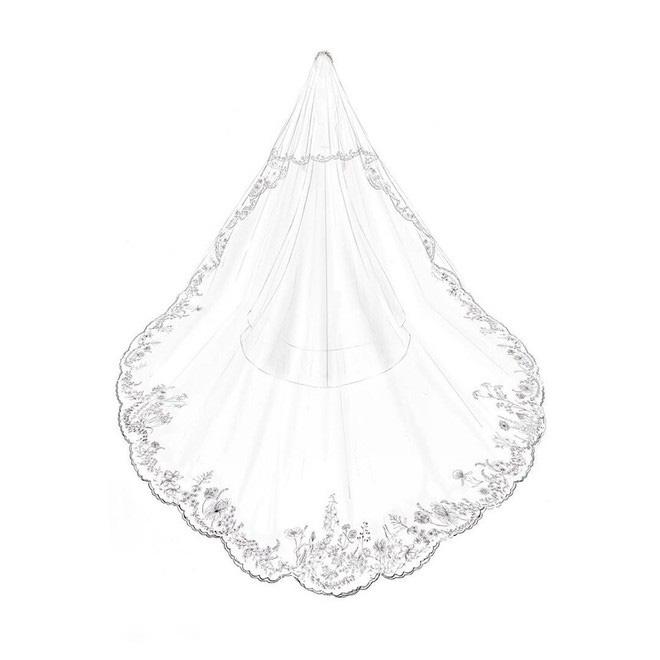 Phần khăn voan dài đến 5m, cùng với đó là chi tiết trang trí 53 bông hoa được thêu hoàn toàn bằng tay. 53 bông hoa cũng là đại diện cho 53 vùng quốc gia và lãnh thổ trong Khối thịnh vượng chung Anh.