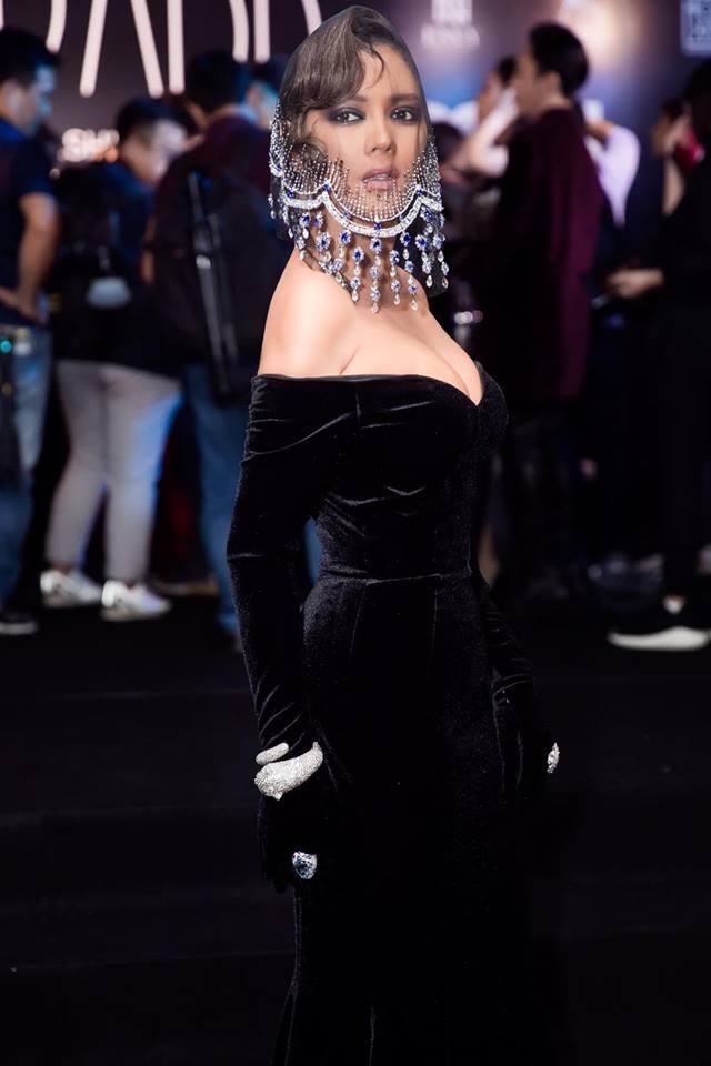 Xuất hiện trên thảm đỏ, Lý Nhã Kỳ nhanh chóng trở thành tâm điểm chú ý bởi diện mạo khác lạ. Người đẹp diện bộ cánh trễ vai màu đen chất liệu nhung khoe bầu ngực căng đầy.