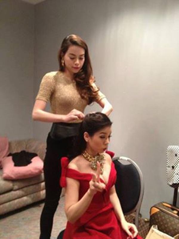 Hồ Ngọc Hà còn tỉ mỉ chăm chút nhan sắc cho Lệ Quyên trước giờ lên sân khấu.