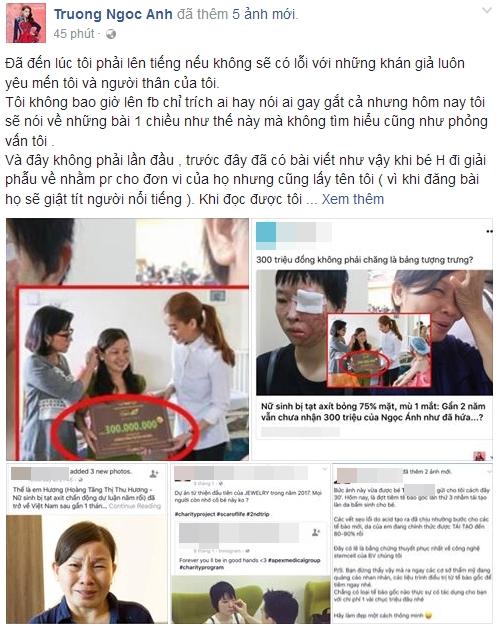 "Đã đến lúc tôi phải lên tiếng, nếu không sẽ có lỗi với những khán giả luôn yêu mến tôi và người thân của tôi. Tôi không bao giờ lên Facebook chỉ trích hay nói ai gay gắt, nhưng hôm nay tôi sẽ nói. Tưởng rằng câu chuyện đi giúp bé Hương đã kết thúc và mình đã làm tròn bổn phận, ai ngờ cứ bị nhắc tên theo kiểu như thế này", Trương Ngọc Ánh lên tiếng.