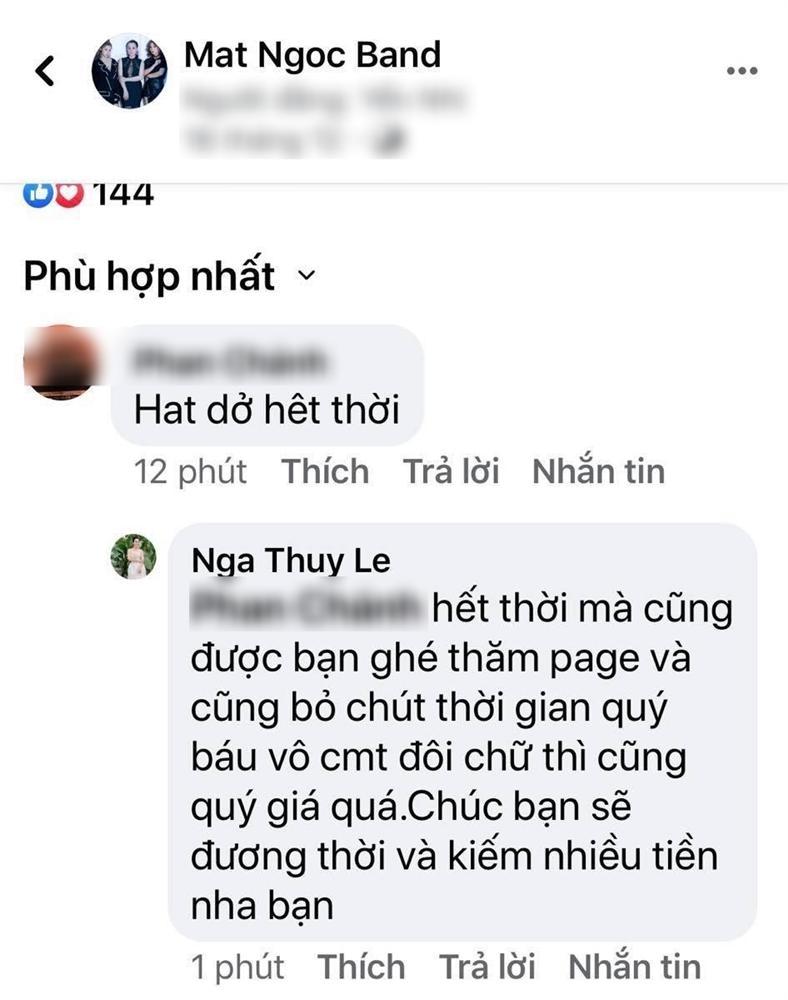 Ngay lập tức, trưởng nhóm Thúy Nga đáp trả: "Hết thời mà cũng được bạn ghé thăm page và cũng bỏ chút thời gian quý báu vào bình luận đôi chữ thì cũng quá quý giá. Chúc bạn sẽ đương thời và kiếm nhiều tiền nha".