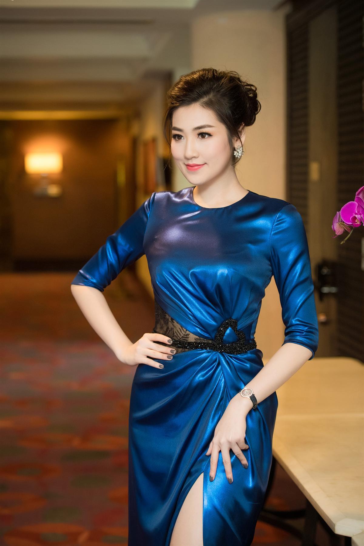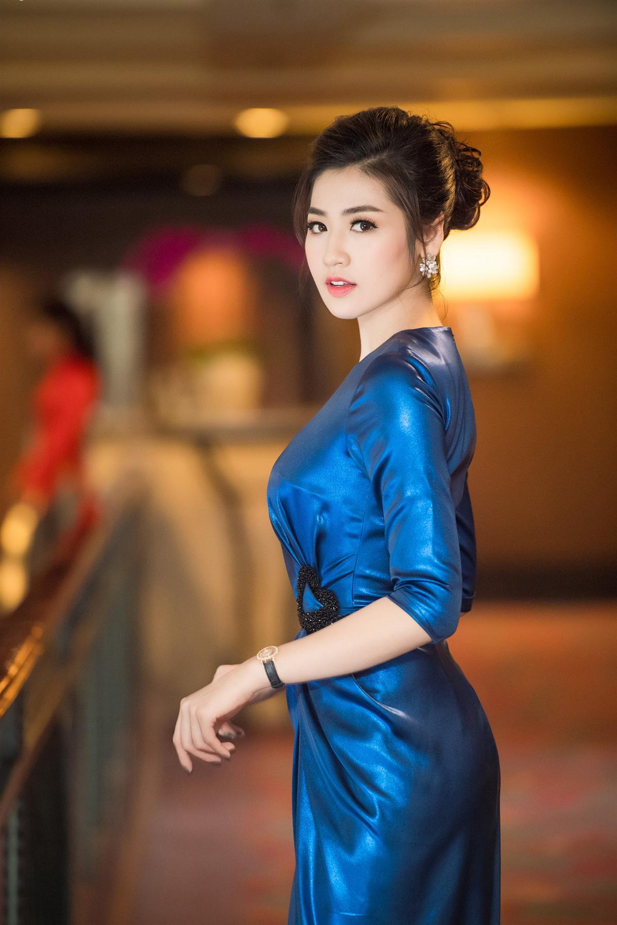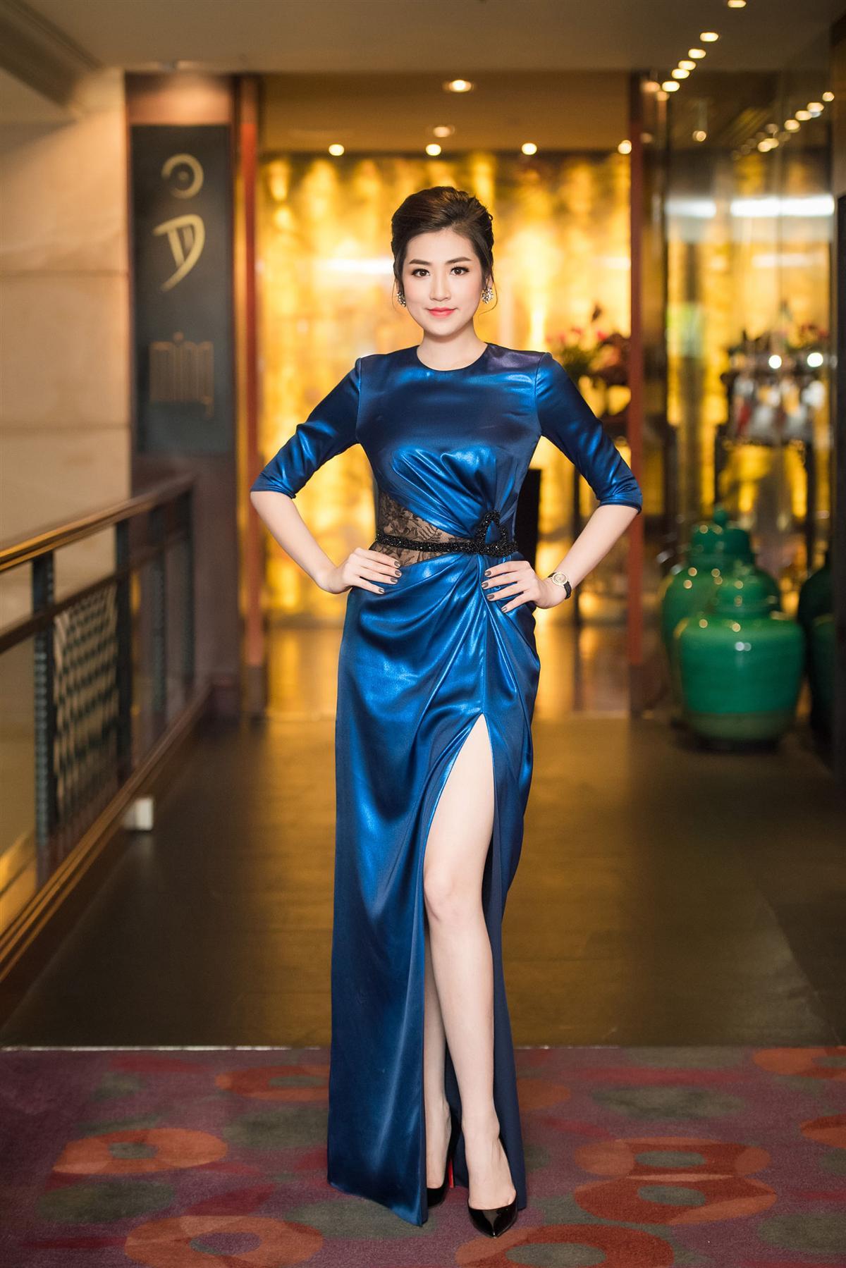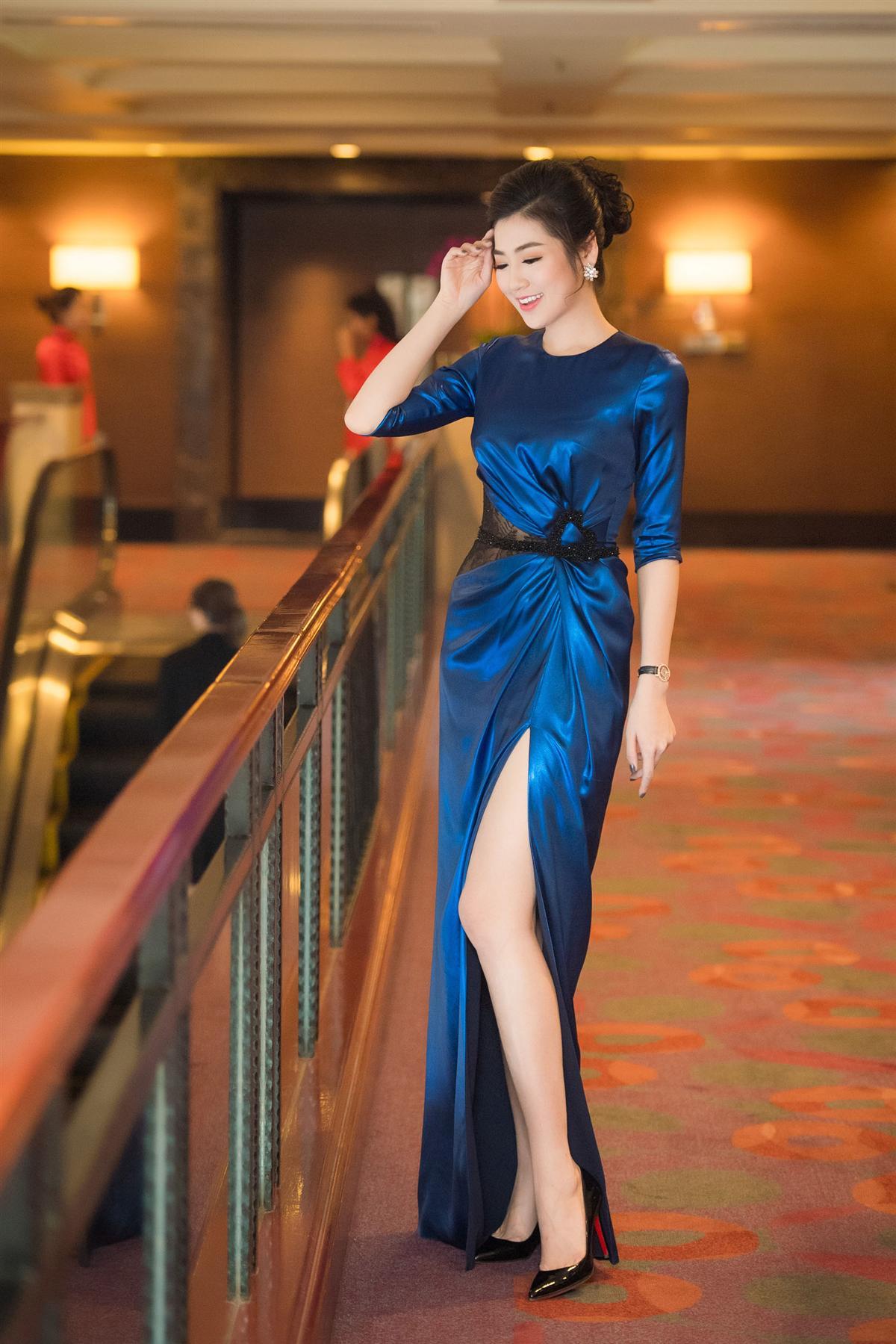 Diện trang phục màu xanh dương nổi bật của nhà thiết kế Lê Thanh Hòa, trên nền chất liệu lụa nhẹ nhàng, óng ánh, phần chi tiết xếp nếp tạo bố cục bất đối xứng kết hợp với ren mỏng, kết hợp cùng chiếc thắt lưng được đính kết cầu kì, tất cả đã tạo nên một thiết kế quyến rũ và sang trọng tôn lên dáng ngọc của Á hậu sinh năm 1993.