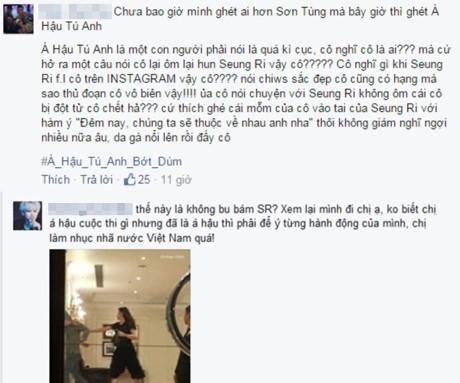 Hàng loạt những lời bình luận ác ý của cộng đồng VIP (fandom của Bigbang) dành cho Tú Anh khi thấy Seungri quàng tay lên vai cô. Những fan này khá hung hãn khi chỉ đích danh cô như: 'chị là ai, chị là cái gì mà có thể thân mật với Seungri như vậy...' và còn rất nhiều bình luận phản cảm khác đổ lên đầu cô Á hậu.
