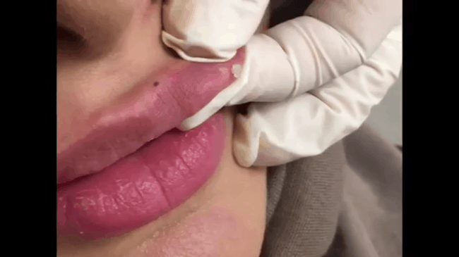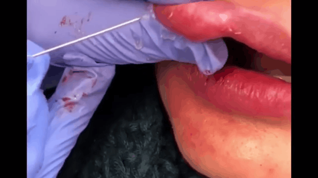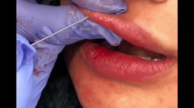 Một người phụ nữ khác cũng gặp phải tình trạng filler trên môi bị đóng cục tương tự, bác sĩ Yursa dùng kim tiệt trùng chọc để tạo lỗ hổng đẩy hết phần filler cũ ra ngoài.