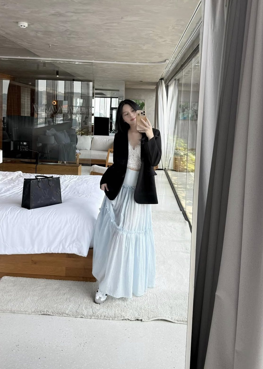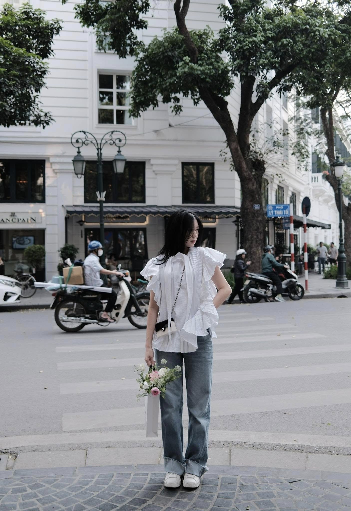 Chất liệu jeans được người đẹp yêu thích để phối với đen, trắng, giúp tổng thể trông trẻ trung, năng động hơn.
