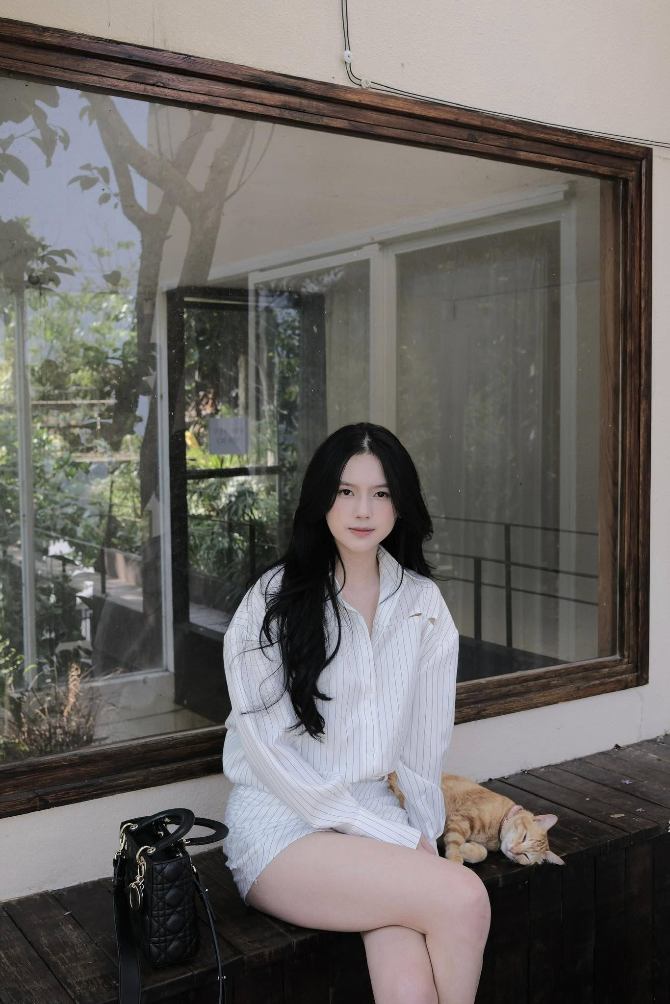 Đầm sơ mi trắng kẻ là món đồ không thể thiếu của cô nàng genZ. Điểm nhấn là chiếc túi size to và đôi giày thể thao năng động.