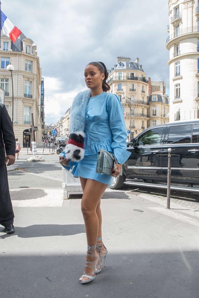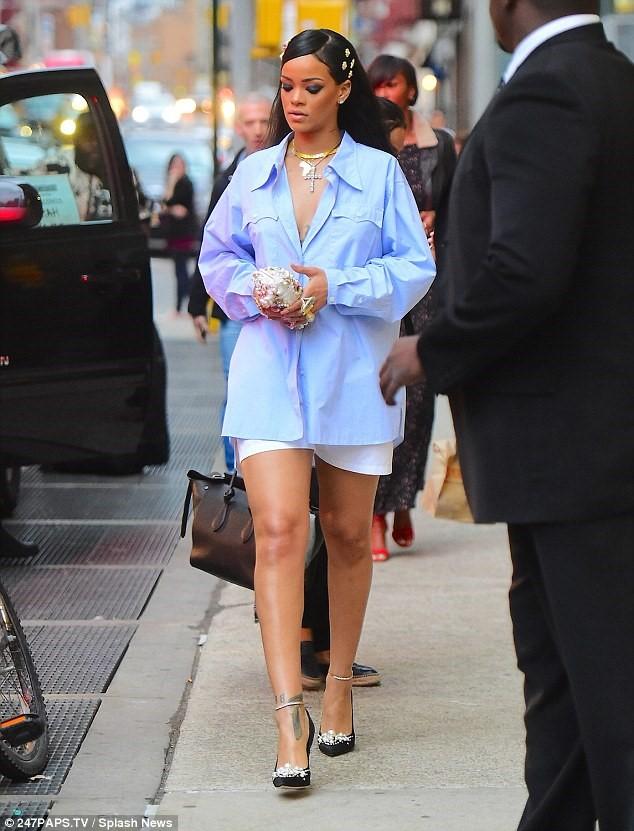 Mốt sơ mi denim kết bèo được Rihanna chọn mặc cùng chân váy ngắn và sandals đan dây mềm mại.