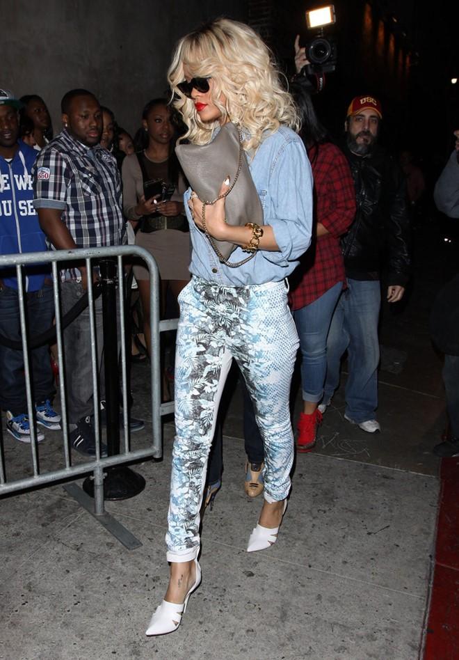Không khó nhận ra Rihanna sử dụng tới 2 chiếc sơ mi denim, một để mặc và một để buộc ngang hông tạo thành kiểu áo lạ mắt.
