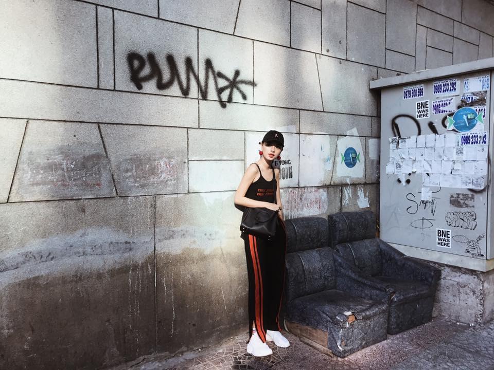 Khỏe khoắn với phong cách sporty cùng quần thể thao kẻ sọc, giầy sneaker, mũ lưỡi trai.